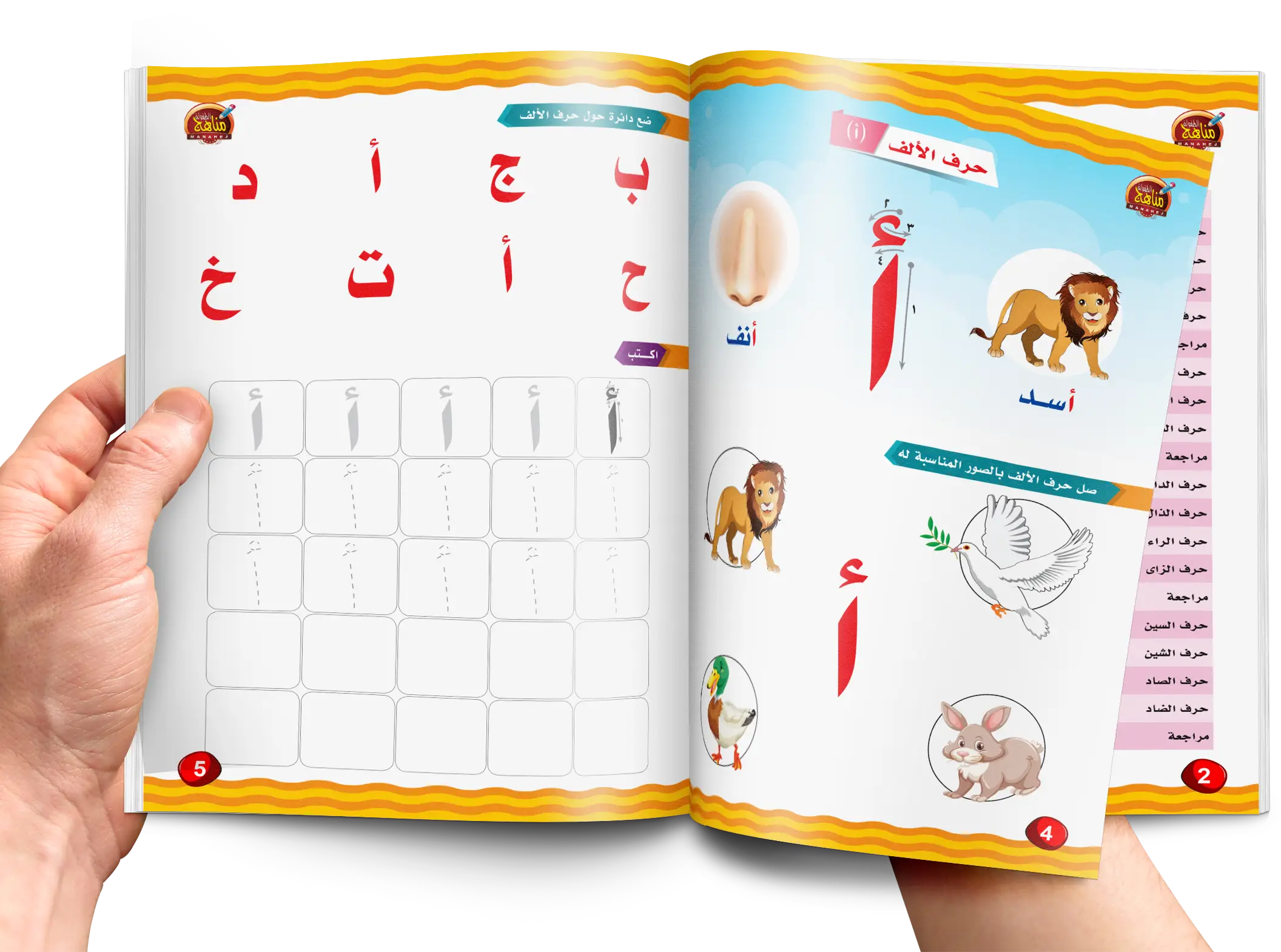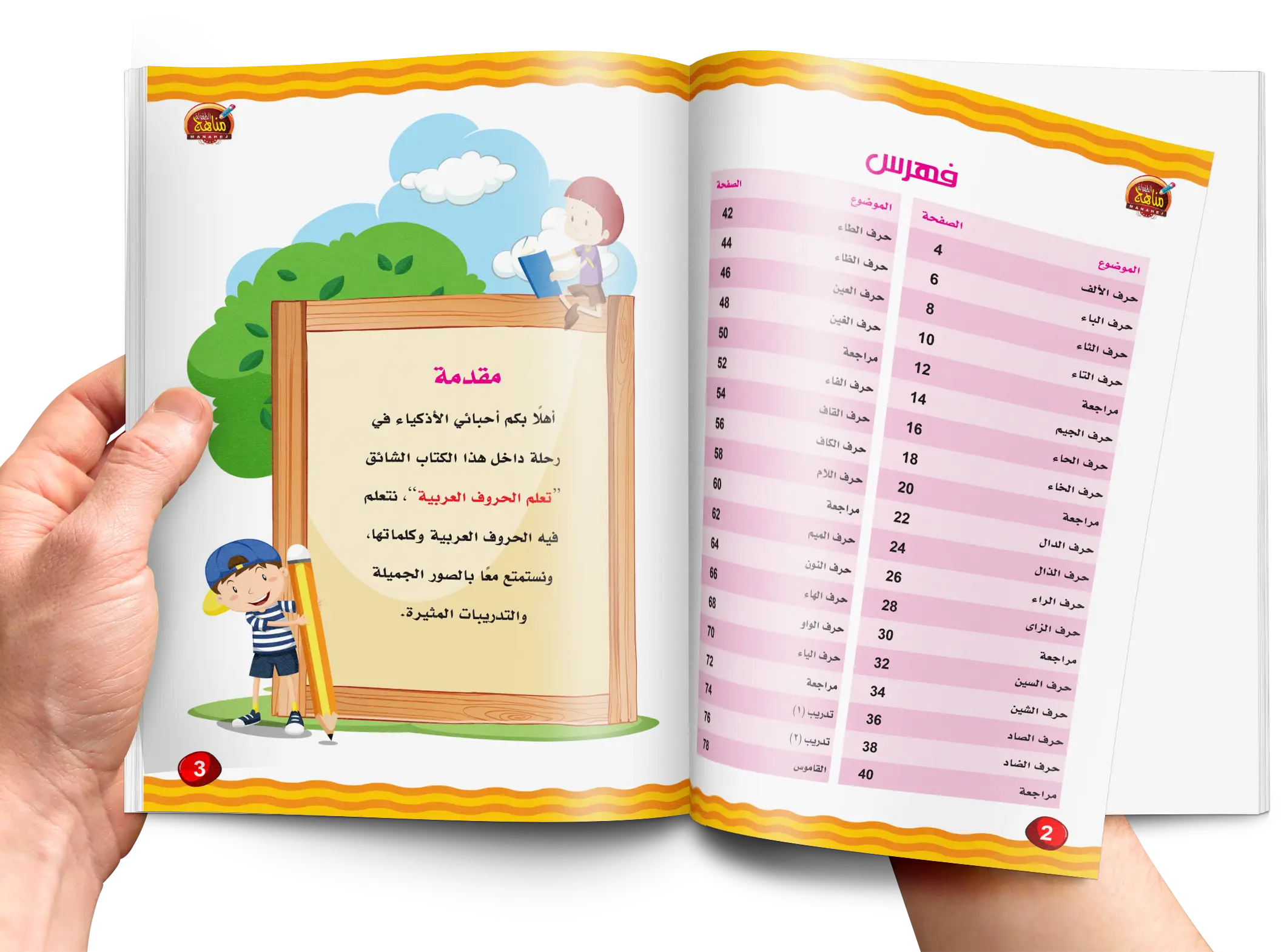 فى هذ الكتاب سوف يتعلم الطفل جميع الحروف العربية كل حرف فى صفحة مستقلة مدعوم بصورة كرتونية محببة للأطفال لتتدعيم الناحية التعليمية ورسم توضيحى لطريقة كتابة كل حرف ، بالإضافة الى ثلاث تدريبات متنوعة عن كل حرف بطريقة سهلة ومحببة للأطفال