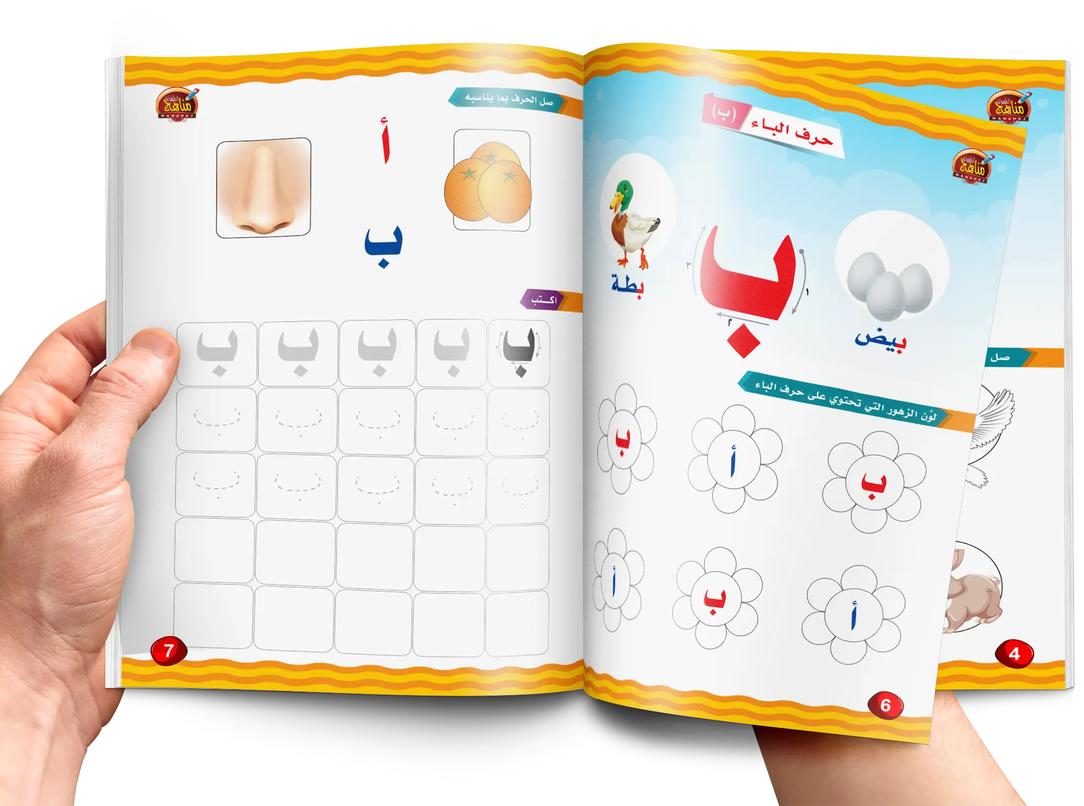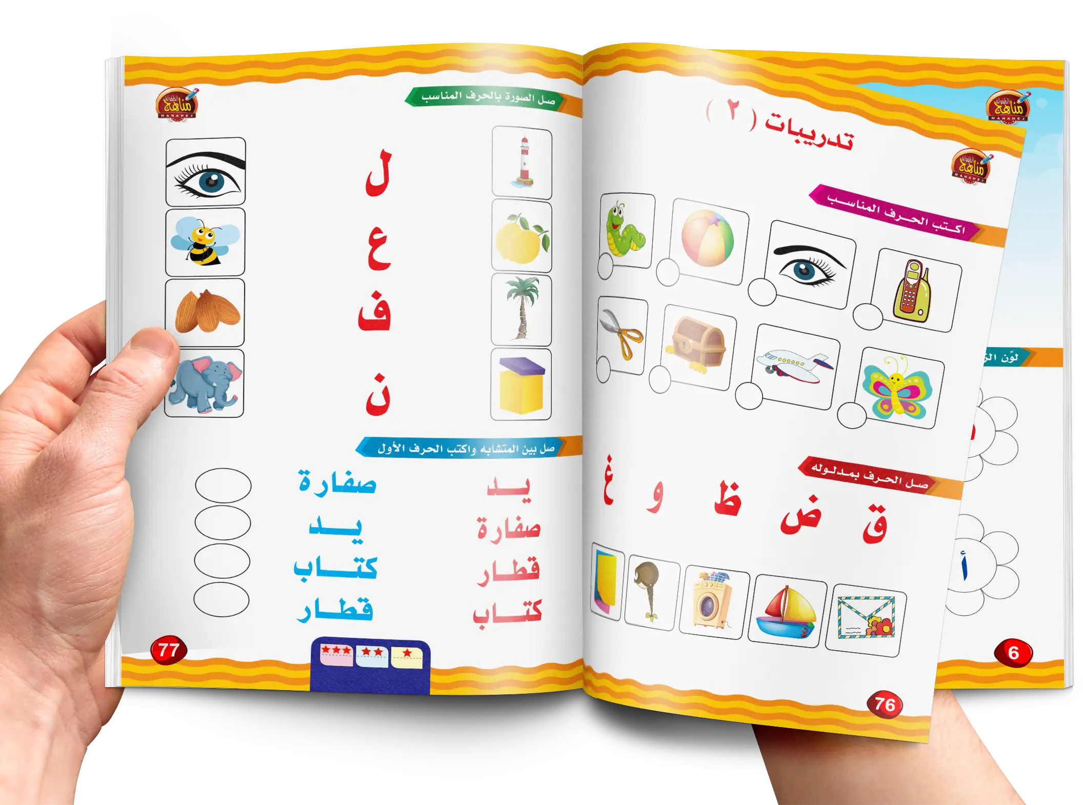 وذلك حتى يستطيع الطفل التدرب على كتابة الحرف عدة مرات لضمان الإجادة التامة لكتابة الحرف. كما توجد تدريبات متنوعة لكل 4 أحرف تهدف إلى تدريب الطفل على كيفية توصيل الأحرف ونطقها وتلوينها وقياس قدرة الطفل على معرفة شكل ورسم كل حرف .