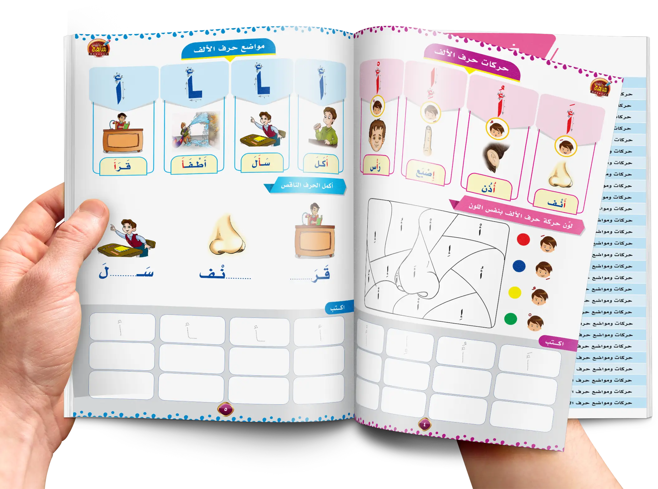• يشمل الكتاب العديد من التدريبات والاختبارات؛ لقياس مدى استيعاب الطفل وإتقانه لكتابة الحروف والكلمات.