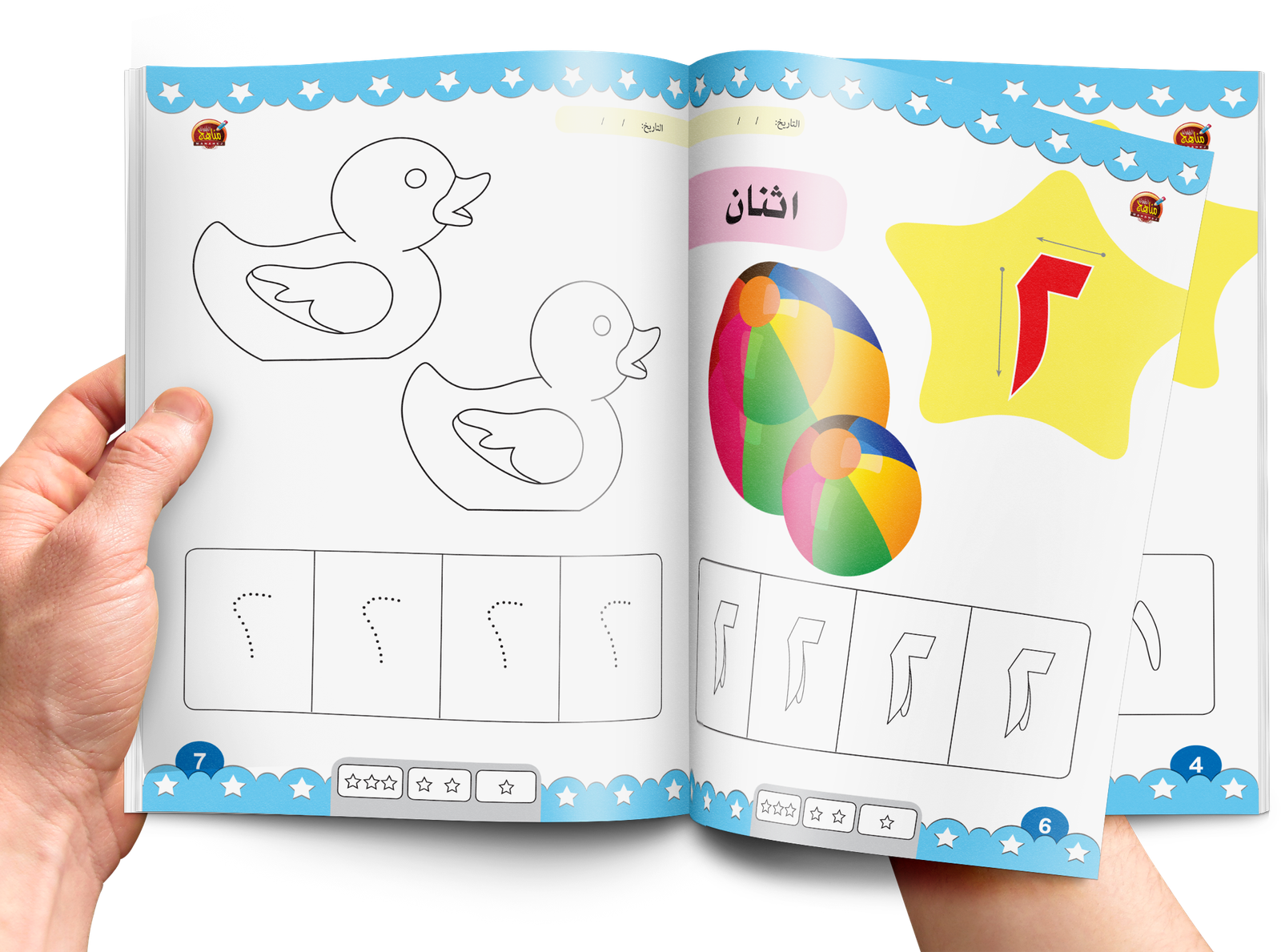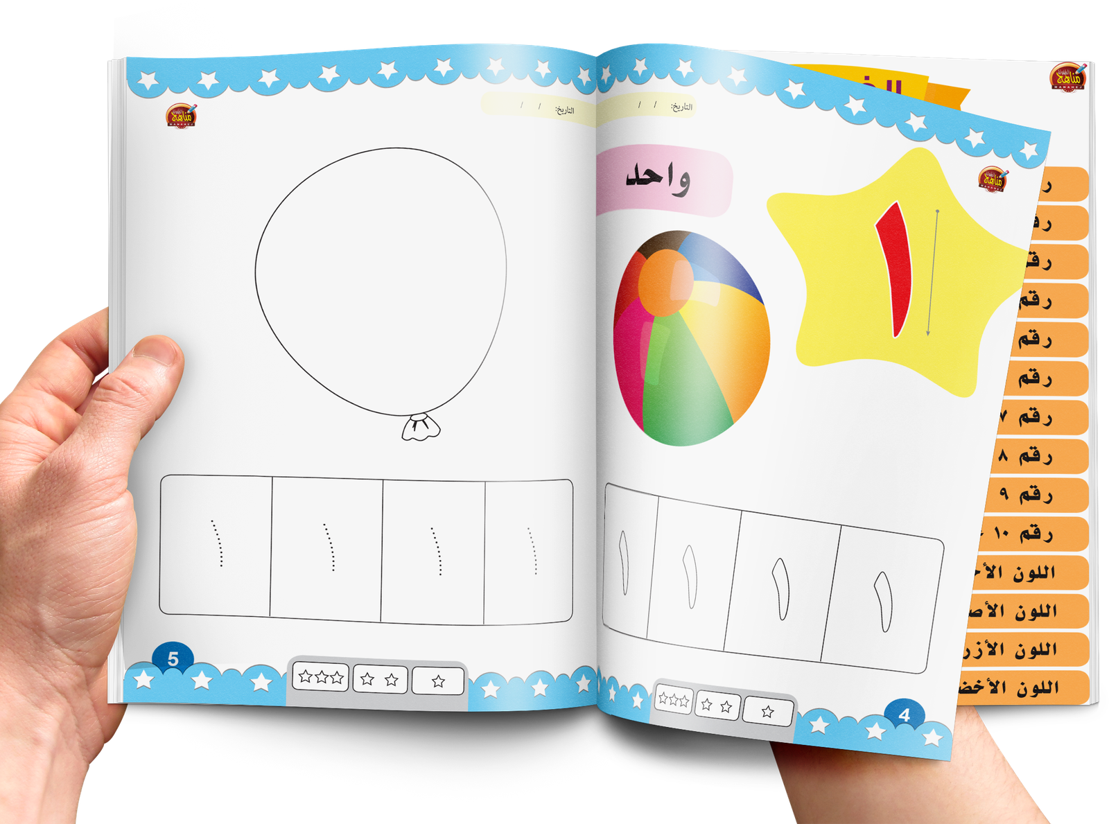 - صفحة التدريب تحتوى على مدلول أخر مفرغ يقوم الطفل بتلوينه ويقوم بتلوين وبتوصيل نقاط الأرقام فى هذه المرحلة .