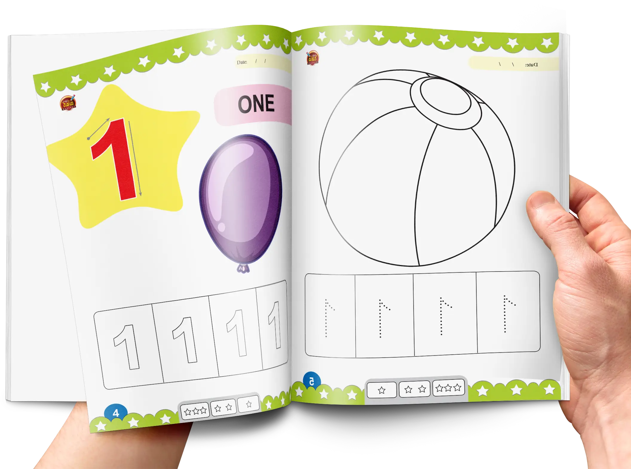- صفحة التدريب تحتوى على مدلول أخر مفرغ يقوم الطفل بتلوينه ويقوم بتلوين وبتوصيل نقاط الأرقام فى هذه المرحلة .